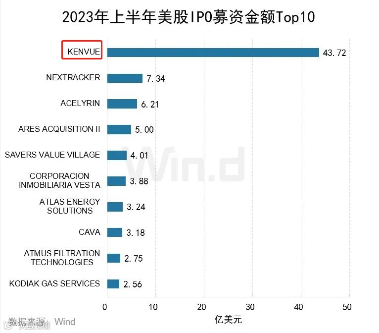 二季度共有12家公司募资超1亿美元,其中强生全资子公司Kenvue,融资43.72亿美元,是唯一一笔超过10亿美元融资,也是截至今年上半年,近三年来最大规模IPO。另外,还有16家公司通过SPAC成功上市,融资总额达19亿美元。