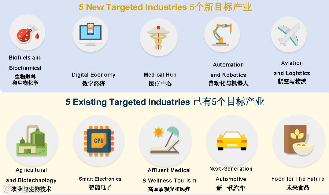 针对中国企业家投资的目标行业如下: 1. 数字产业 2. 橡胶、乳胶行业 3. 汽车、电动汽车及零部件 4. 机械及零件/自动化及机器人 5. 通信系统设备及零部件 6. 生物技术 7. 电子产品及零部件 8. 制造/修理飞机/航空航天装置与设备 9. 医疗器械及零部件 10. 火车与铁路运输设备