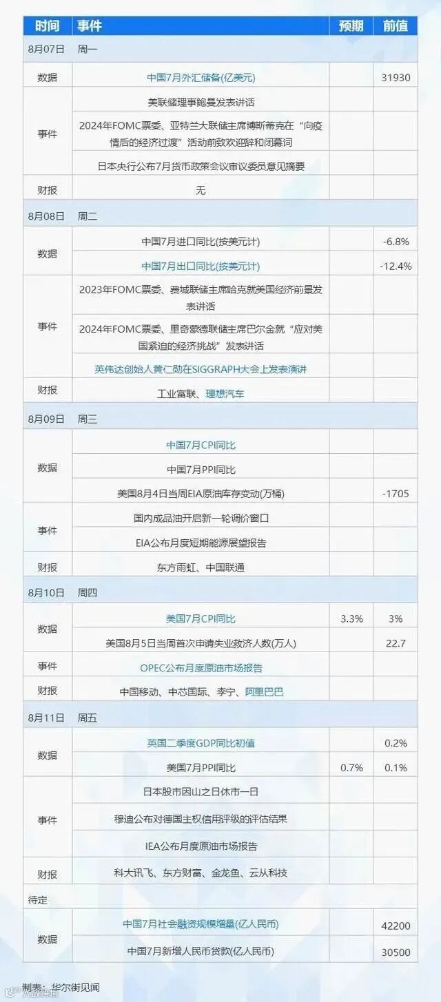 本周聚焦中美7月CPI和PPI通胀数据、中国7月金融数据和进出口数据;央行方面,美联储理事鲍曼等四位美国央行高官发表讲话。另外,阿里巴巴、理想汽车等重要上市公司公布最新财报,英伟达创始人黄仁勋在SIGGRAPH大会上发表演讲,OPEC公布月度原油市场报告。