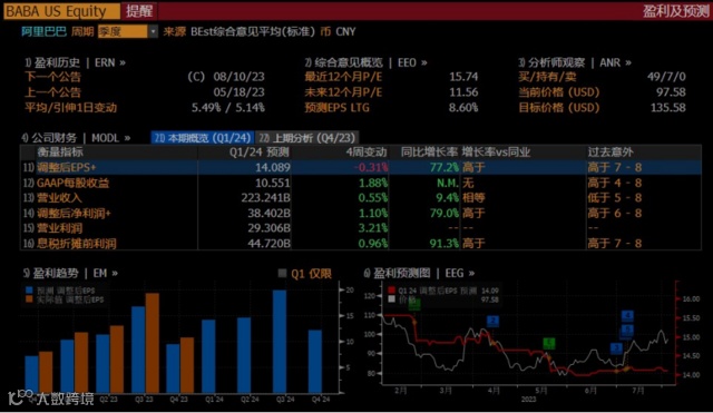 ◊ 阿里巴巴将于周四公布最新财报。据彭博社调查,分析预计,阿里巴巴第二季度(2024财年第一季度)营收2232.4亿元,同比增长9.4%,调整后净利润384亿元,同比增长79%。