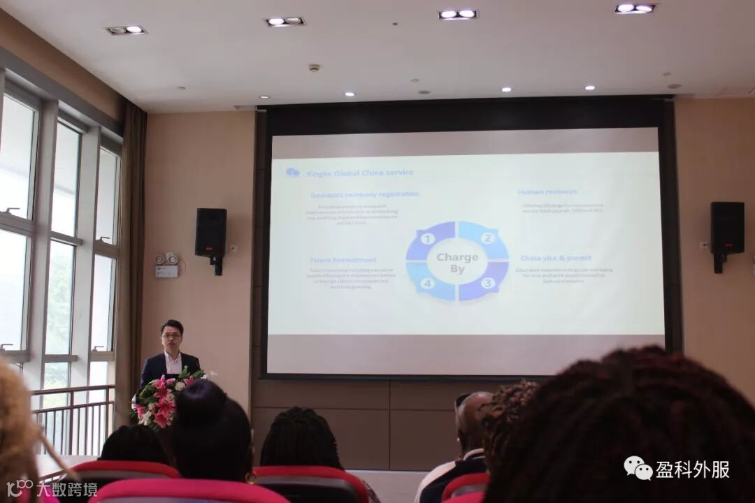 在公司精心安排下,跨境投服中心Jack邵主任为外宾介绍盈科外服发展历程、发展成就与公司人力业务模式。