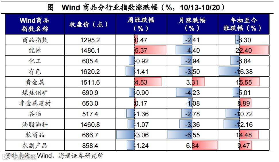 上周,国内Wind商品跌多涨少。各板块中,能源、贵金属及非金属建材板块上涨,涨幅分别为5.37%、4.53%和0.17%。其余板块均下跌,其中软商品板块以3.06%的幅度领跌,农副产品、谷物及油脂油料板块跌幅也不小,分别下跌1.24%、1.36%和1.07%。