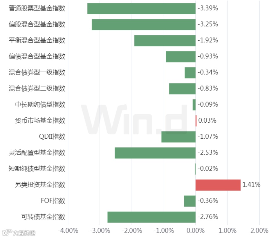 普通股票型基金指数、偏股混合型基金指数、可转债基金指数表现不佳,收益率分别为:-3.39%、-3.25%、-2.76%。