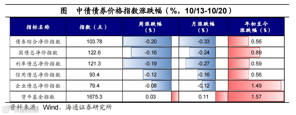 从价格表现看,上周利率债、信用债净价指数下跌。其中中债利率债总净价指数下跌0.19%,国债总净价指数下跌0.16%,信用债总净价指数下跌0.12%,企业债总净价指数下跌0.08%。此外,货币基金指数上涨0.03%。