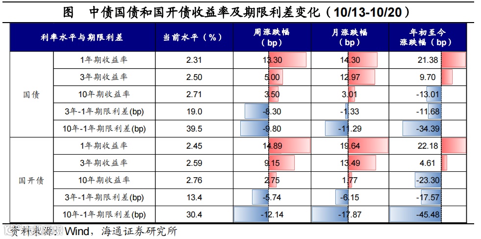 国内上周,主要利率上行。10年期国债收益率上行3.50bp至2.71%,10年期国开债收益率上行2.75bp至2.76%。短端的1年期国债利率上行13.30bp至2.31%,1年期国开债利率上行14.89bp至2.45%。期限利差方面,10Y-1Y国债利差下行9.80bp至39.5bp,3Y-1Y国债利差下行8.30bp至19.0bp;10Y-1Y国开债利差下行12.14bp至30.4bp。