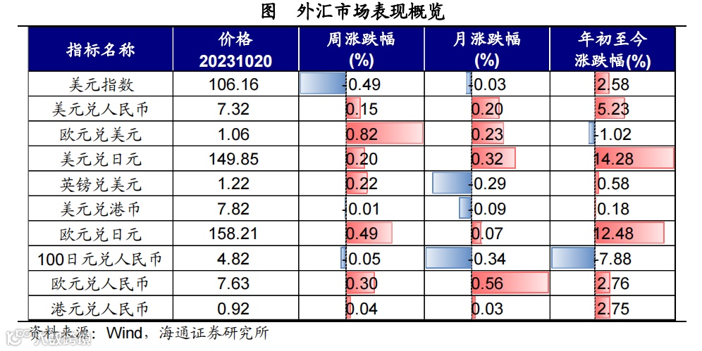 美元指数下跌。截至10月20日,美元指数共下跌52个BP报收106.16。人民币走弱,截至10月20日美元兑人民币报收7.315。日元小幅跌至1美元兑149.85日元,继续逼近150关口;欧元兑美元小幅升值0.22%,报收1.059。