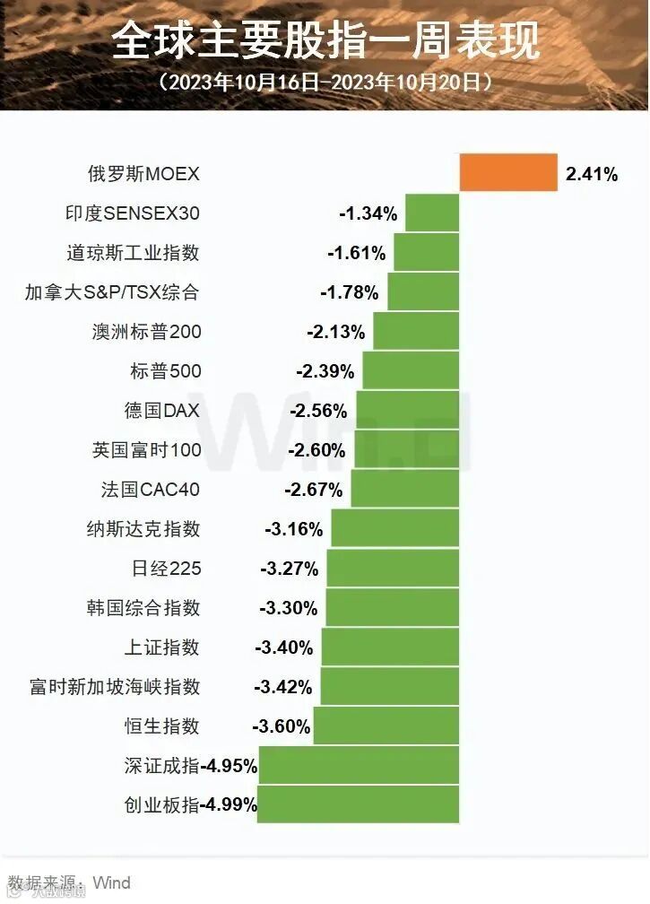上周5个交易日中(10月16日至10月20日),全球主要股指呈现普跌。Wind数据显示,在17个全球主要股指中,仅有俄罗斯MOEX指数小幅上涨2.41%。其余16个股指均实现下跌,占比高达94%,而且绝大多数跌幅超过2%。