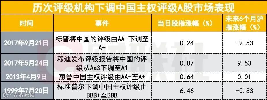 复盘评级机构历次下调中国主权评级或展望后,沪指走势显示,下调对市场影响并不大,与市场的走势也并无相关性。