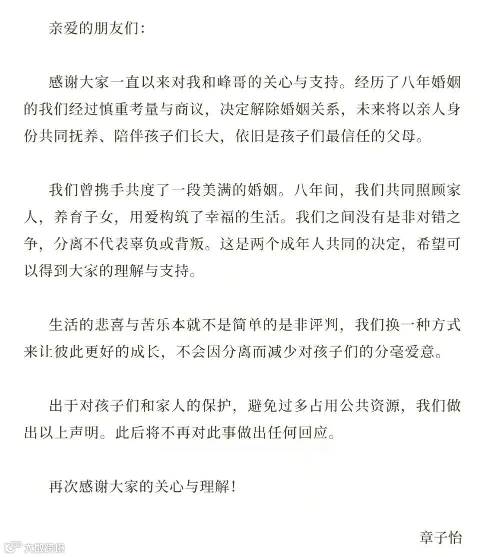 10月23日15时42分,汪峰、章子怡同时在微博发文称,“经历了八年婚姻的我们经过慎重考量与商议,决定解除婚姻关系,未来将以亲人身份共同抚养、陪伴孩子们长大,依旧是孩子们最信任的父母。”
