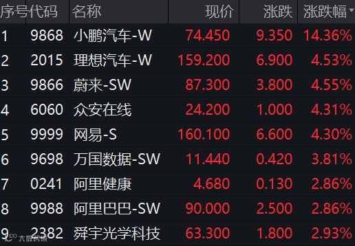 大型科技股全线高开。今日开盘,小鹏汽车-W涨14.13%,理想汽车-W涨6.7%,蔚来-SW涨6.65%,阿里巴巴-SW涨4.97%,快手-W涨5.75%。
