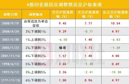 专业人士称,从1990年至今,中国股票交易印花税共历经 12 次变化,其中上调 2 次、下调 7 次。2000 年后共对印花税做出 4 次调整,主要涉及税率高低和征收方式,调整主要政策目标是维系证券市场宏观稳定,每次对印花税的调整均可以带动短期交易情绪上升。