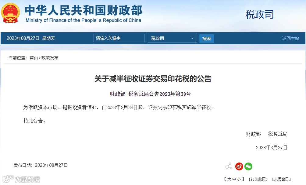 8月27日,财政部、税务总局发布《关于减半征收证券交易印花税的公告》表示,为活跃资本市场、提振投资者信心,自2023年8月28日起,证券交易印花税实施减半征收。