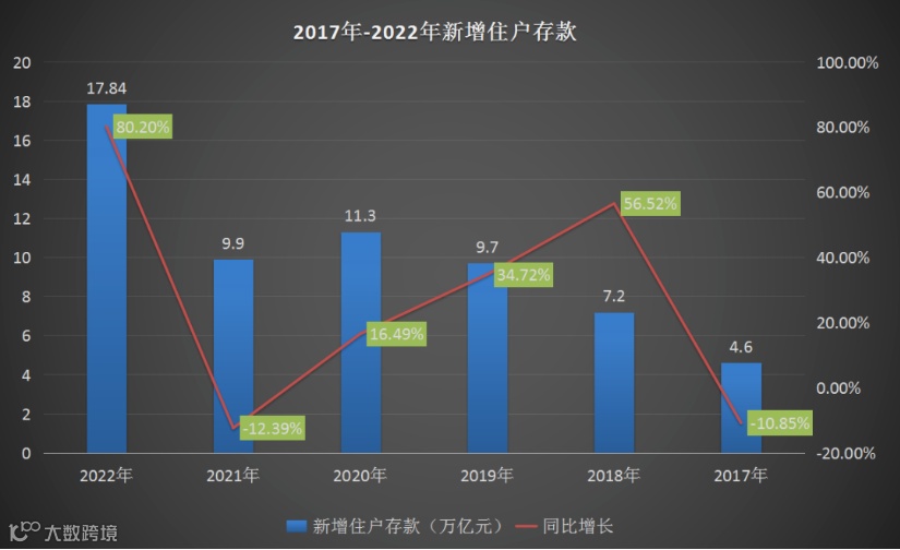 央行数据,今年一季度居民存款增加9.9万亿,相当于2021年全年居民存款增量,与2022年17.84万亿的增量相比,超过去年全年新增额的一半。