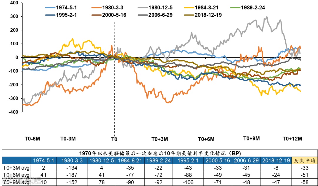 1970年以来美联储最后一次加息后,10年期美债利率变化