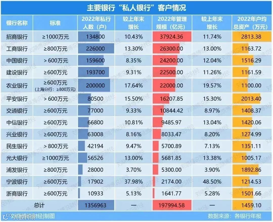 上图是截至2022年末,14家大银行私人银行里的资产,平均每个账户接近1500万人民币,涉及到的账户达到135.7万个。而这些钱,显然只是富裕家庭比较少的一部分。