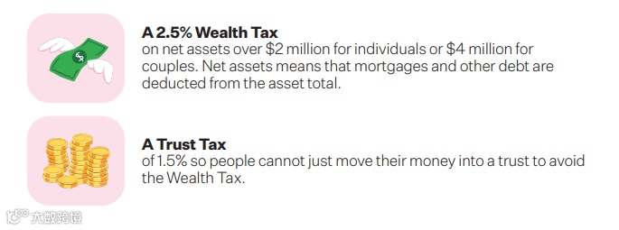 新西兰绿党计划对“净资产超过400万纽币的伴侣与净资产超过200万纽币的个人”征收2.5%的财富税。据统计,在新西兰,需要缴纳“财富税”的富豪约占总人口的0.7%。