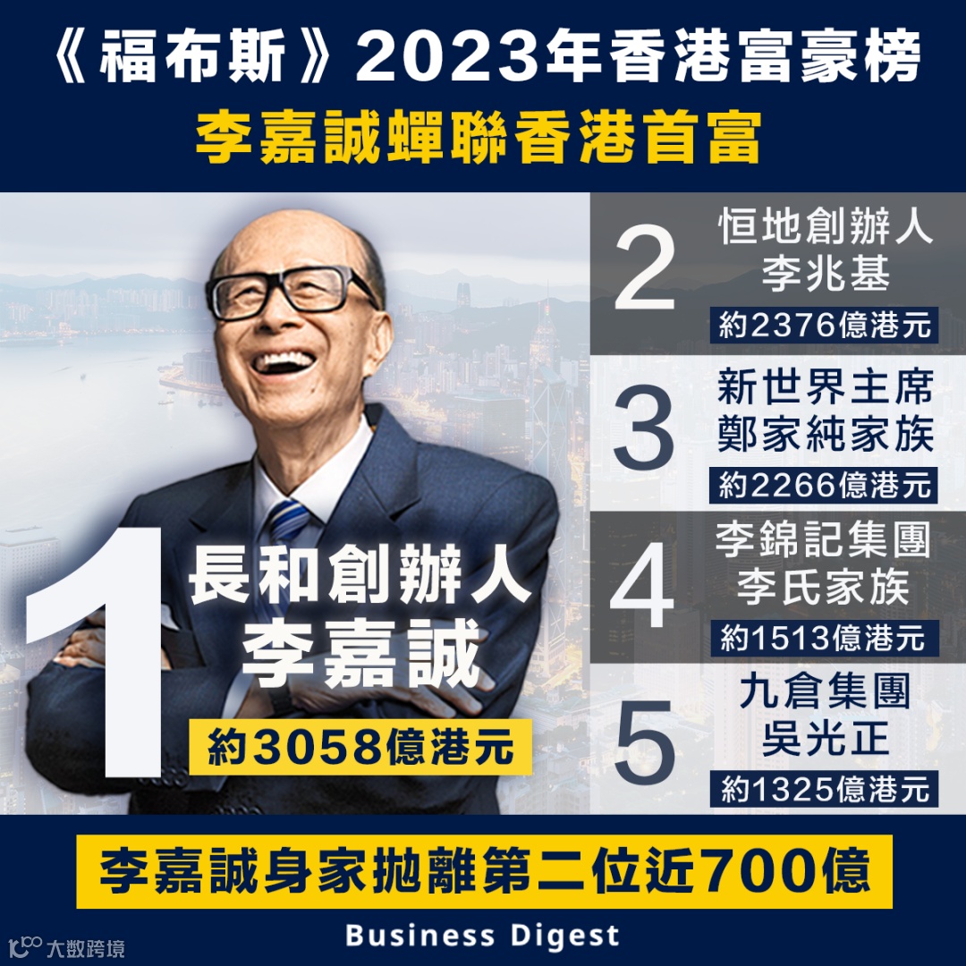 福布斯公布年度香港50大富豪排行榜,长和系创办人兼高级顾问李嘉诚蝉联首富宝座,身家约390亿美元。