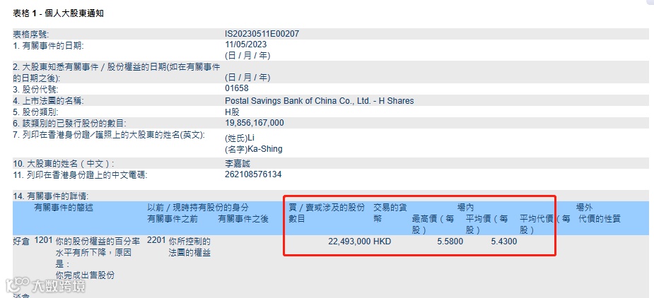 同日,李嘉诚及李泽钜旗下的私人公司Silvery Ring,转让逾1.96亿股邮储银行H股至家族信托。按当日收盘价计算,这笔股份市值超10亿港元。