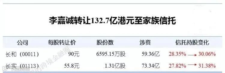 2018年下半年,长和(00001.HK)和长实(01113.HK)同时披露,李嘉诚又将其个人名下所持合计133亿股份,转到了家族信托里,转让后,李氏帝国几乎所有资产全部搭乘上了家族信托这个母舰。