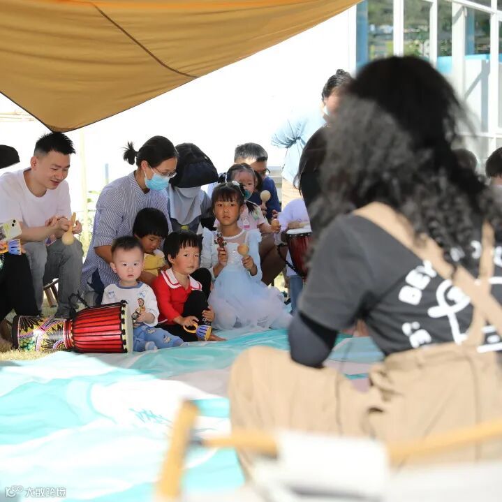 活动以鼓圈亲子音乐开场,大小朋友们围坐成一个圆圈,跟着老师的节奏一起互动起来,一起感受亲子陪伴的快乐时光。