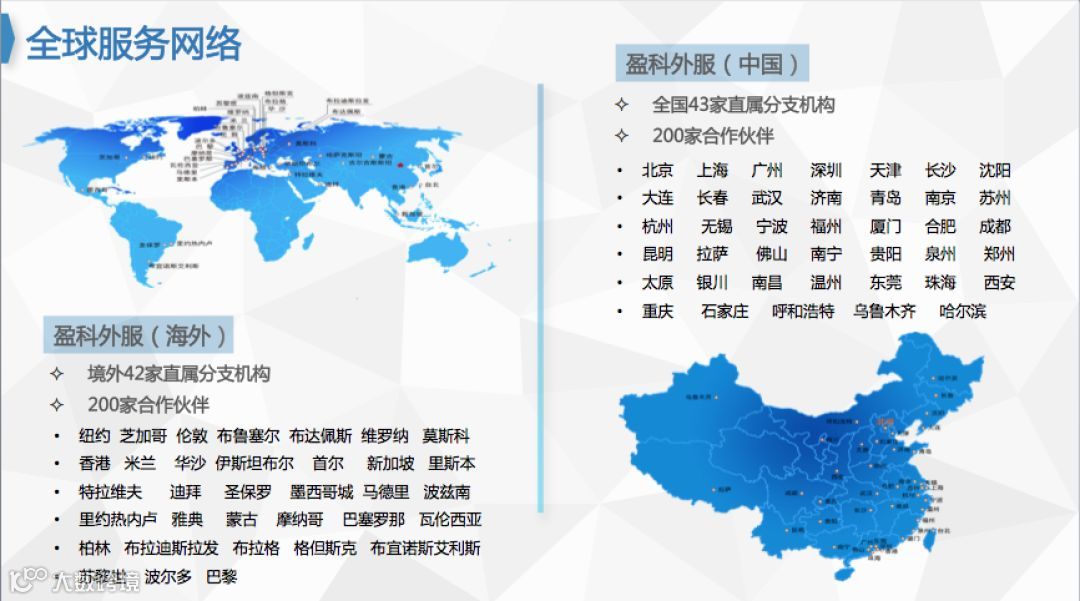 盈科外服集团总部位于上海,在中国42个主要城市设有分支机构,并在美国、英国、德国、意大利、迪拜、新加坡、香港、印尼、菲律宾、马来西亚等超过41个海外主要国家和地区设有分支机构。依托亚太最大的律师事务所——盈科律师事务所的优质资源与广阔平台,盈科外服在海外投资、外商投资、财税咨询、人力资源等领域为客户提供全球性、综合性、专业化的咨询服务。