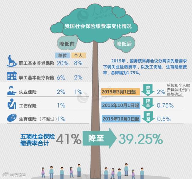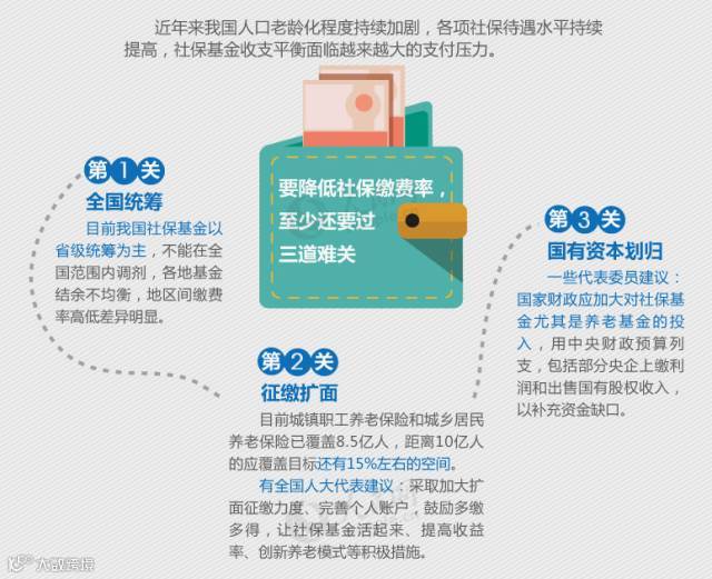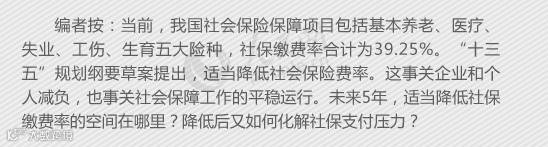 当前,我国社保包括基本养老、医疗、失业、工伤、生育五大险种,缴费率合计为39.25%。适当降低社保缴费率的空间在哪里?降低后如何化解社保支付压力?戳图了解——