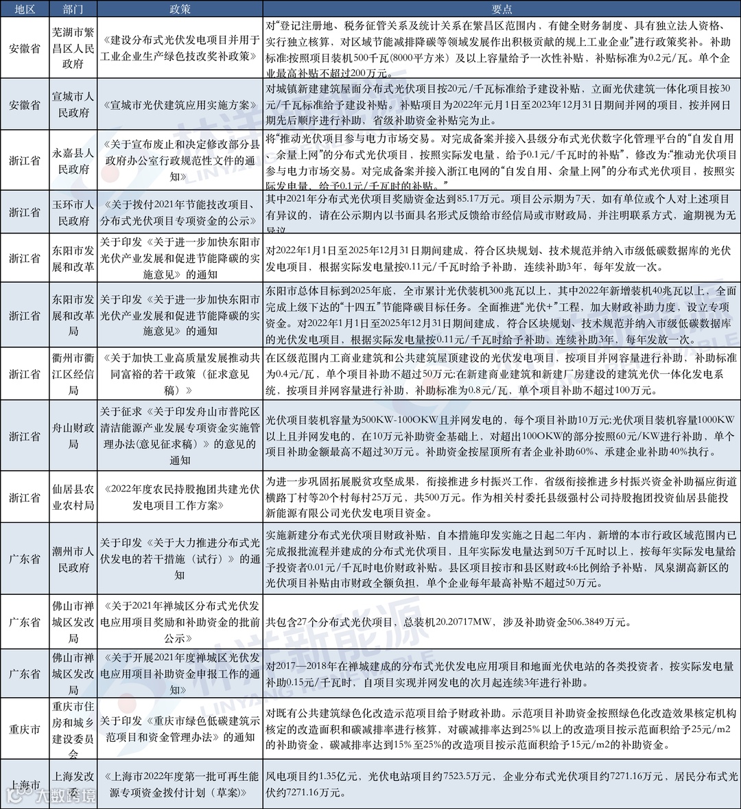 地方层面,市场与政策双轮驱动,各地新时期发展规划中多有涉及光伏等新能源产业,并对发展目标及完成标准提出了具体要求。部分政策涉及分布式和大型风光电基地,还提到了“光伏+”创新利用、光伏项目开发、光伏出口等诸多方面。此外,在光伏补贴、光伏项目建设、电力市场等方面亦有相关政策出台。