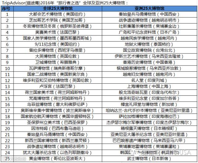 TripAdvisor(猫途鹰)9月13日公布了2016年“旅行者之选”全球最佳博物馆榜单。该榜单是根据TripAdvisor(猫途鹰)网站和APP上全球用户在过去一年内对博物馆的评分、点评内容与数量综合计算而来,反映了世界各地的博物馆在过去一年内受全球游客欢迎的程度。