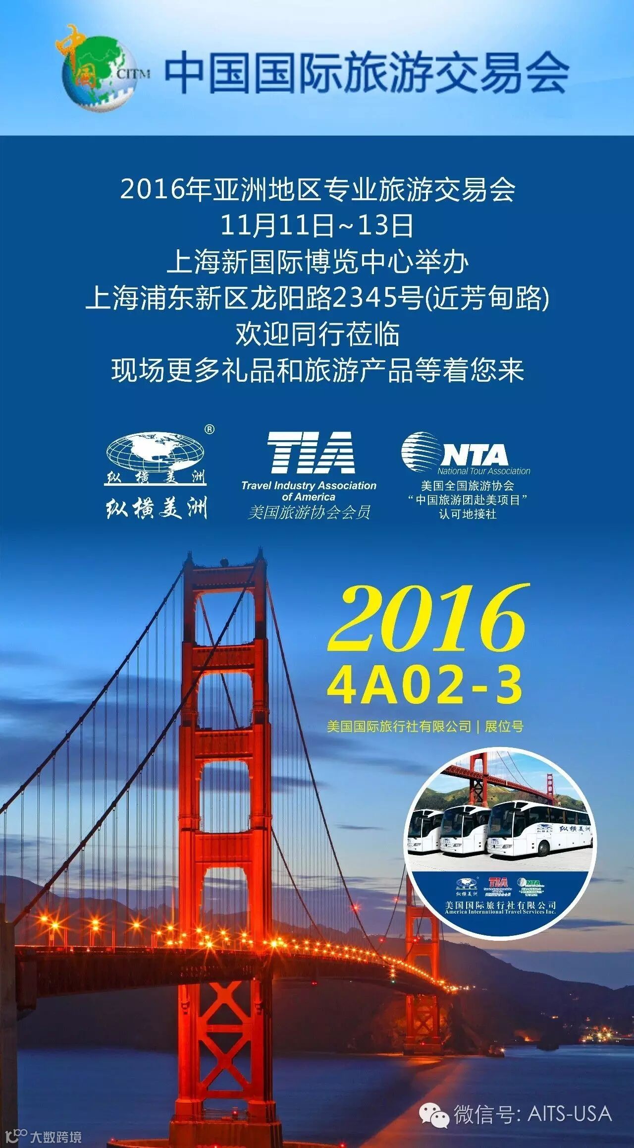 2016年11月11日-13日,亚洲地区的专业旅游交易会—中国国际旅游交易会将在上海新国际博览中心举行。届时纵横美洲·美国国际旅行社有限公司也将在四号馆4A02- 3与您相约。