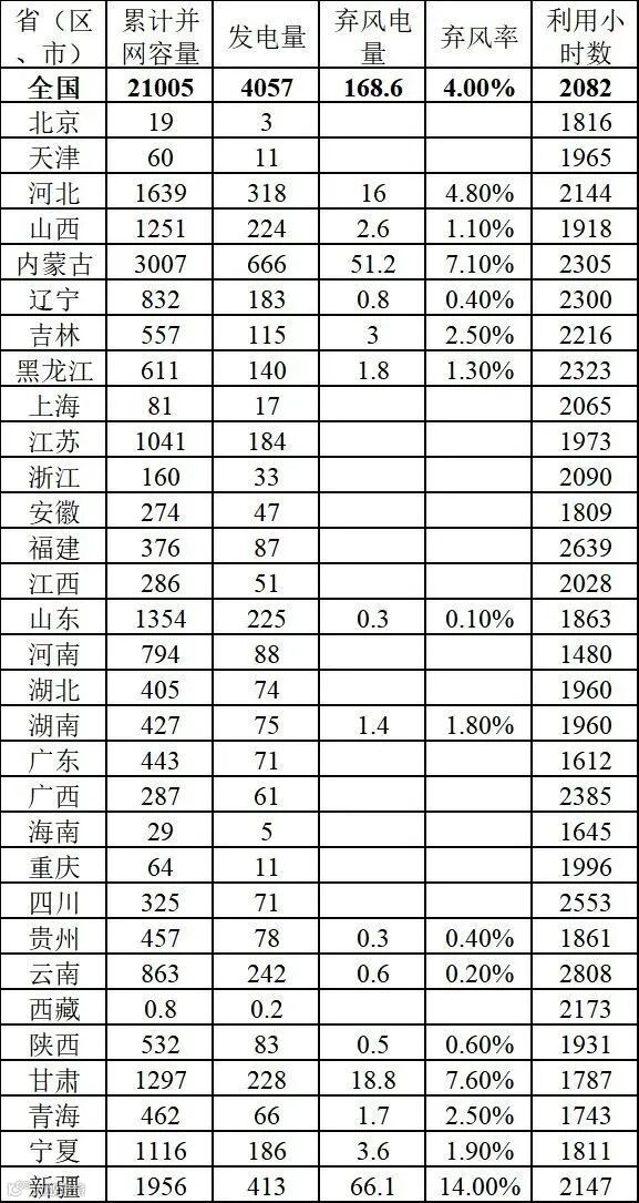 3.弃风电量、弃风率来源于国家可再生能源中心、相关电网企业。数据为空白的表示不存在弃风现象。