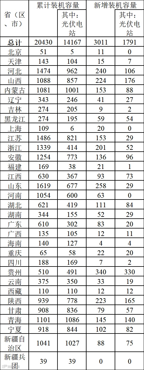 从新增装机布局看,华北地区新增装机858万千瓦,同比下降24.0%,占全国的28.5%;东北地区新增装机153万千瓦,同比下降60.3%,占全国的5.1%;华东地区新增装机531万千瓦,同比下降50.1%,占全国的17.5%;华中地区新增装机348万千瓦,同比下降47.6%,占全国的11.6%;西北地区新增装机649万千瓦,同比下降1.7%,占全国的21.6%;华南地区新增装机472万千瓦,同比下降5.1%,占全国的15.7%。