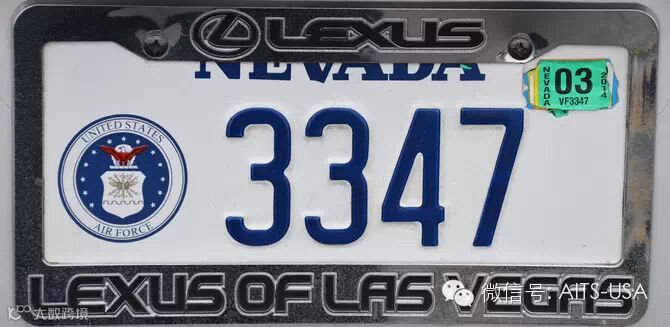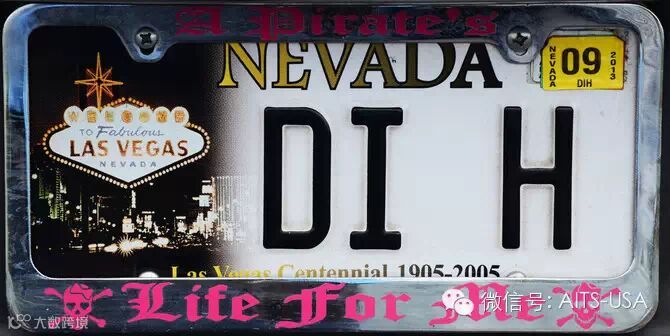 这是在拉斯维加斯最常见的车牌,图案是该市的欢迎标志。这个车牌只有三位,应该是比较有钱的人了:)