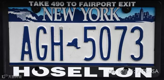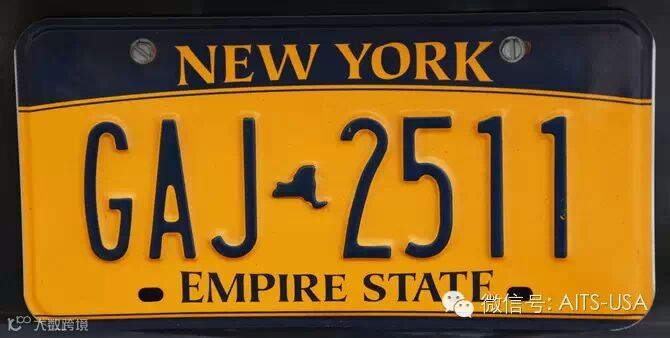 这是街头最常见的纽约州车牌,上面有州地图轮廓,以及”帝国之州“字样。
