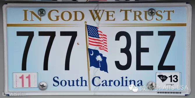南卡罗来纳州的车牌中央是美国国旗和该州的州旗,上面醒目地写着”我们信奉上帝“(跟美元上一样哦)