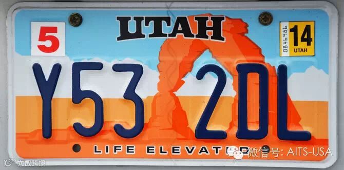 尤它州拥有多处著名的国家公园,最常见的车牌上是拱门国家公园内的“精致拱门”图案。