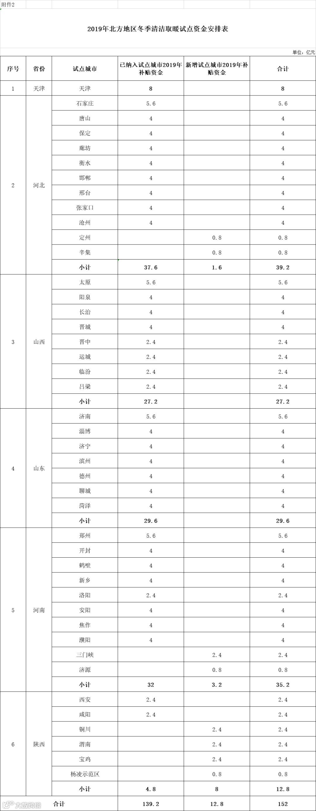 二、北方地区冬季清洁取暖试点补助资金试点城市名单及资金额详见附件2。请相关省(自治区、直辖市)抓紧将资金拨付到试点城市,会同有关部门督促试点城市积极稳妥地做好清洁取暖工作。纳入第三批试点范围的城市要尽快做好清洁取暖实施方案,于2019年7月20日前报送生态环境部、财政部、住房和城乡建设部、国家能源局,四部门审核通过后予以备案,作为地方实施清洁取暖改造和绩效评价的重要依据。