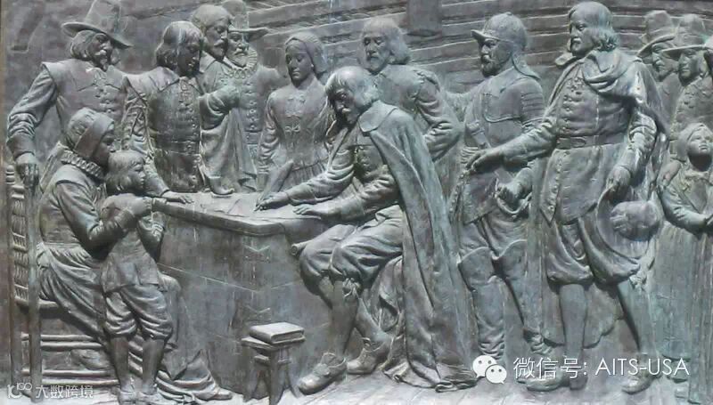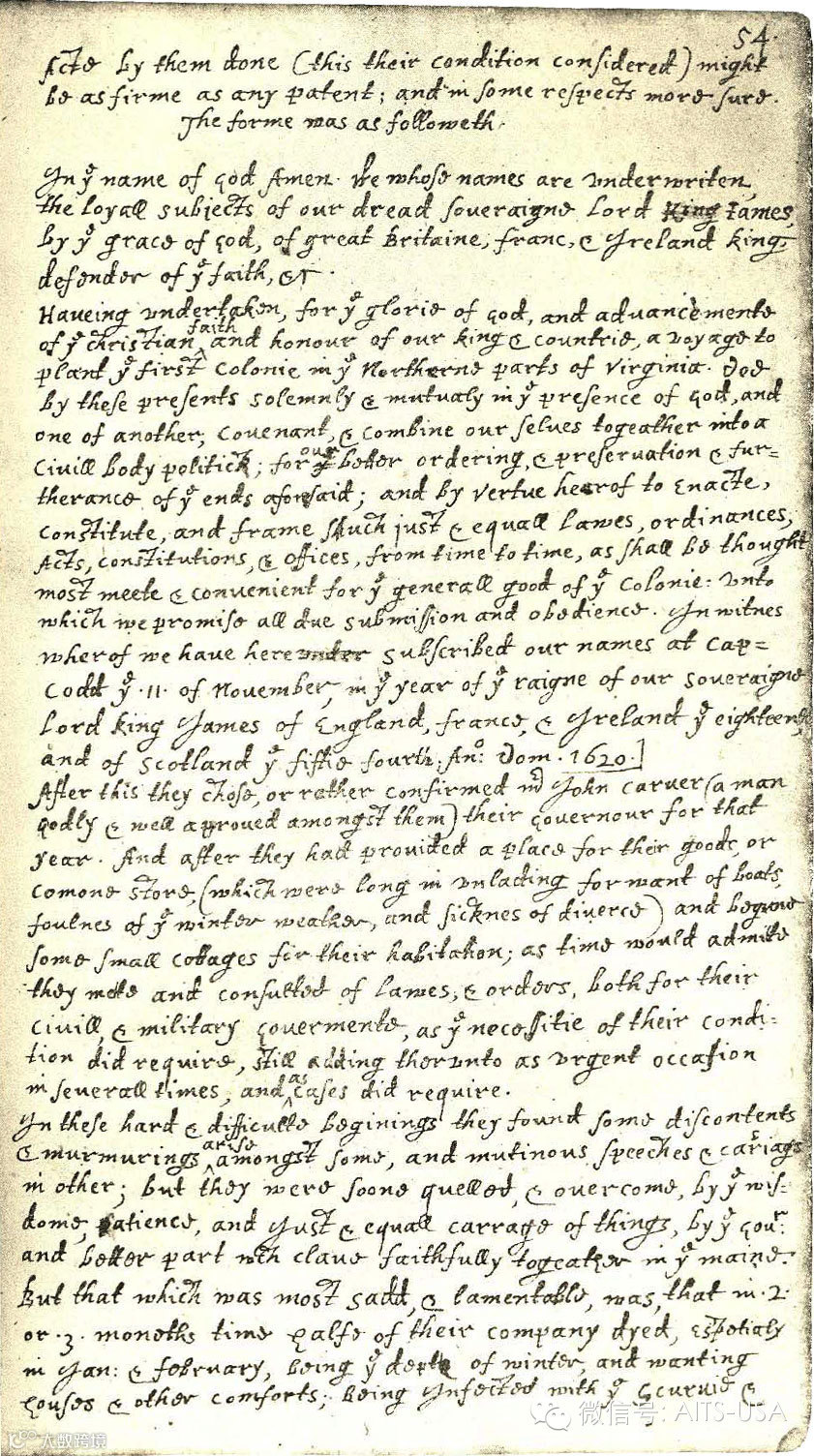 《五月花号公约》写道:“为了上帝的荣耀,为了增加基督教的信仰,为了提高我们国王和国家的荣耀,我们飘洋过海,在弗吉尼亚北部开发第一个殖民地。我们这些签署人在上帝面前共同庄严立誓签约,自愿结为民众自治团体。为了使上述目地能得到更好的实施、维护和发展,将来不时依此而制定颁布,被认为是对这殖民地全体人民都最合适、最方便的法律、法规、条令、宪章和公职,我们都保证遵守和服从。”