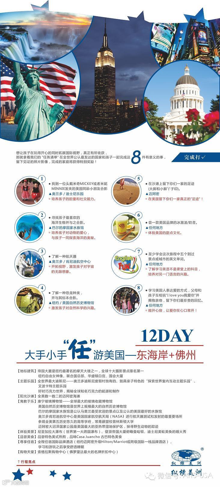 【大手小手,“任”游美国】系列产品隆重来袭!带着8个任务出行美国,完成的家庭将获得神秘大礼包!任务到底是什么呢?来看下我们的行程海报吧!(如果字体太小影响阅读,请将下图保存到手机后放大阅读)