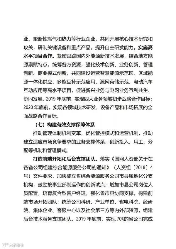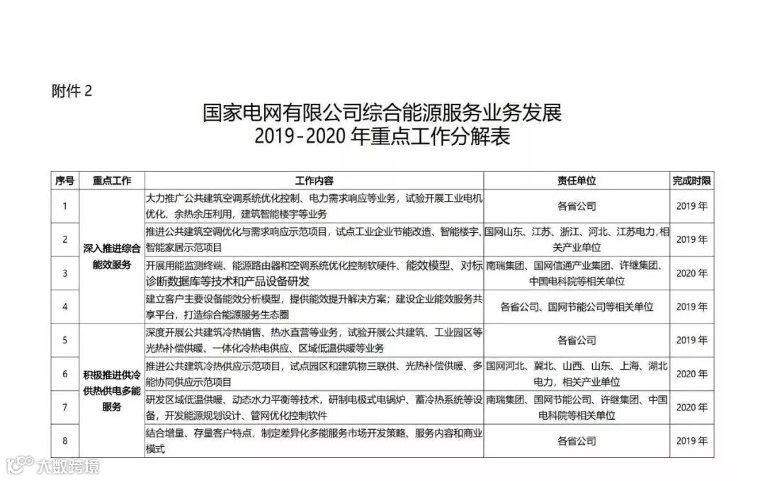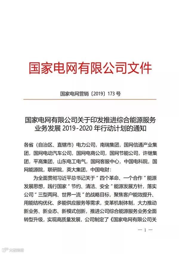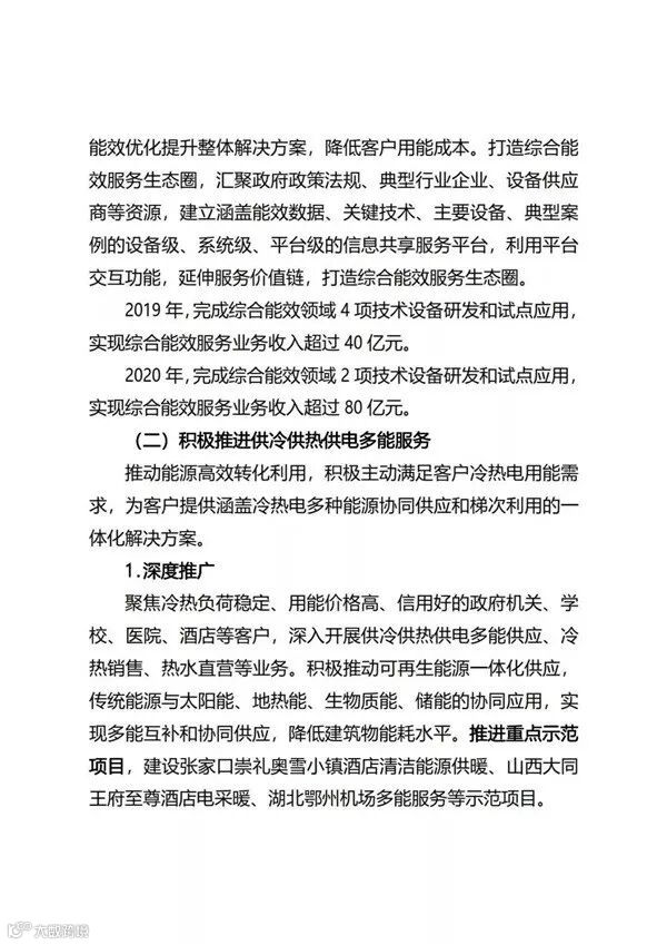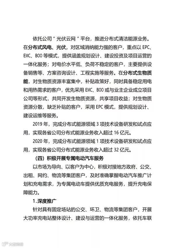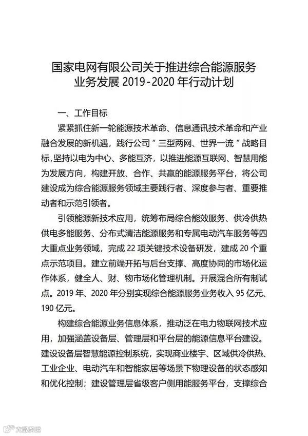 国家电网公司自2017年正式进入综合能源服务领域以来,目前已经成立了26家省级综合能源服务公司。近日,国家电网正式印发了《国家电网有限公司关于推进综合能源服务业务发展2019—2020年行动计划》,重点布局综合能效服务、多能供应服务、分布式能源、专属电动汽车服务等四大业务;2019年、2020年分别实现营收95亿元、190亿元。