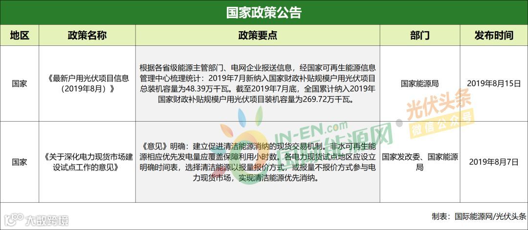 分布式光伏政策来看,国家能源局公布了最新户用光伏项目信息(2019年8月)统计数据,下表进行了简要统计,具体到各省,欲需要项目详细名单可在留言区留言获取。