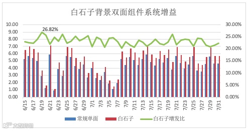 由测试数据可以看出,6月19日白石子背景双面组件系统增益最高达26.82%,平均增益为22.80% 。