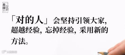 很多时候,人们更愿意重复以往同样的方法和措施,或许会比以往的成本低一些、速度快一点。对企业来说,今天继续重复昨天的做法会容易很多,风险看起来也许会小一些,但是「对的人」更清楚如果固守经验,被淘汰则必然成为现实,这个风险显然要大得多,所以「对的人」会坚持引领大家,超越经验,忘掉经验,采用新的方法。