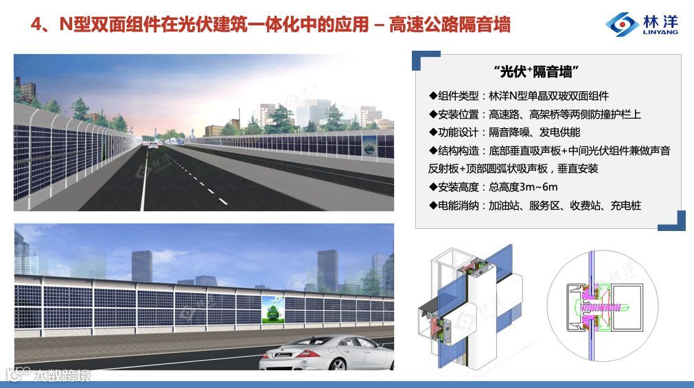 最后潘院长介绍了N型双面组件在建筑光伏一体化中的常见应用:光伏隔音墙、光伏围栏、建筑围墙、光伏车棚、光伏窗间墙、遮阴棚、建筑幕墙等,展现了双面组件在光伏建筑中广泛的应用和市场。