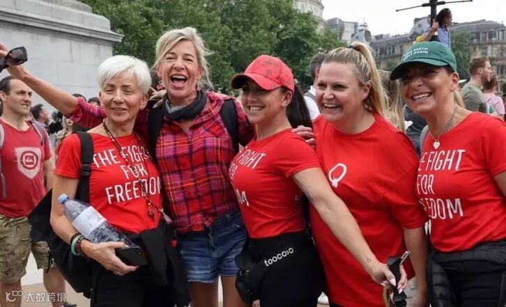 疫情以来多次参加游行的疫苗怀疑论者皮尔斯·科尔宾(Piers Corbyn)与英国著名媒体人,专栏作家,电视真人秀评委凯蒂·霍普金斯(Katie Hopkins)等人一起参加了这次活动。