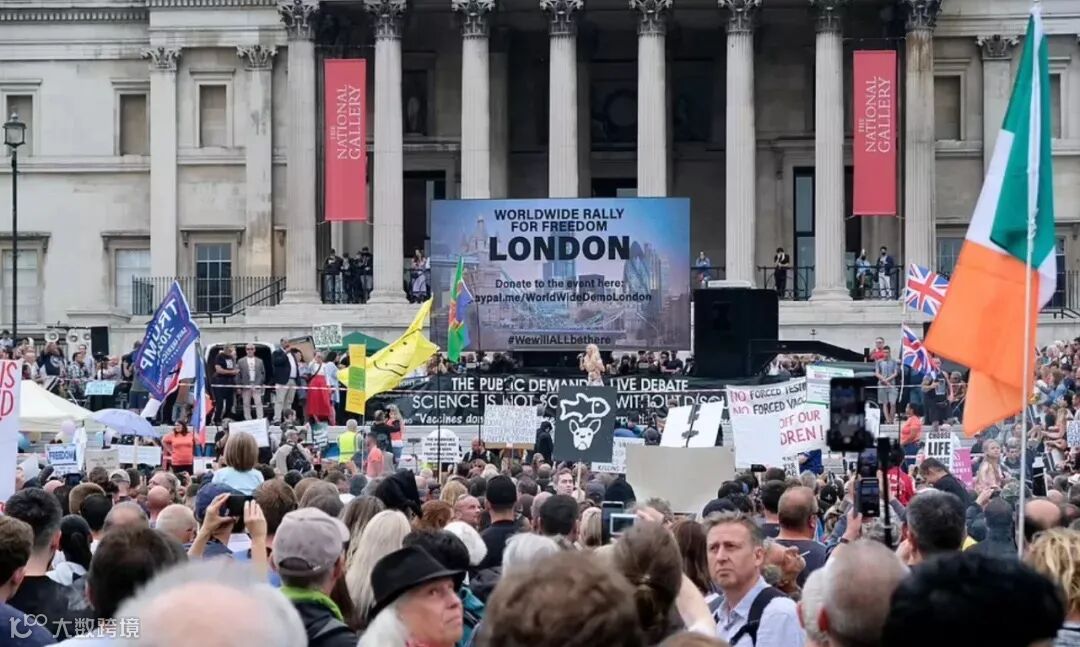 当天下午,数万人手持旗帜和标语牌来到伦敦特拉法加广场,反对新冠封锁、强制接种疫苗和疫苗护照。