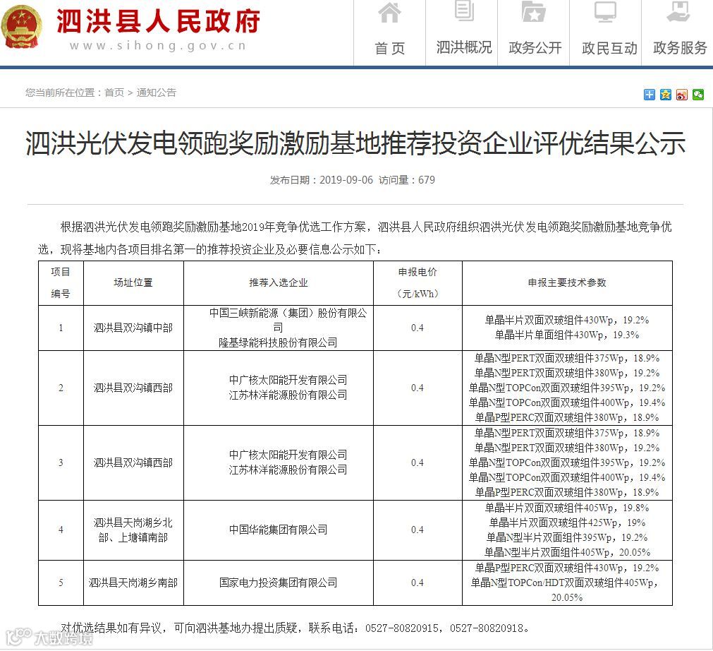 根据泗洪光伏发电领跑奖励激励基地2019年竞争优选工作方案,泗洪县人民政府组织泗洪光伏发电领跑奖励激励基地竞争优选,现将基地内各项目排名第一的推荐投资企业及必要信息公示如下: