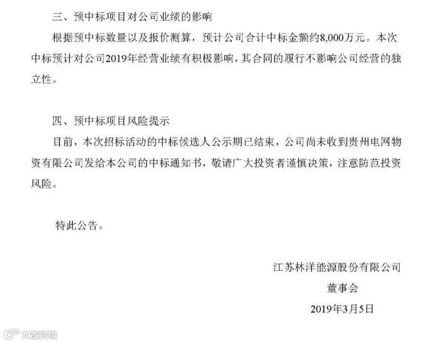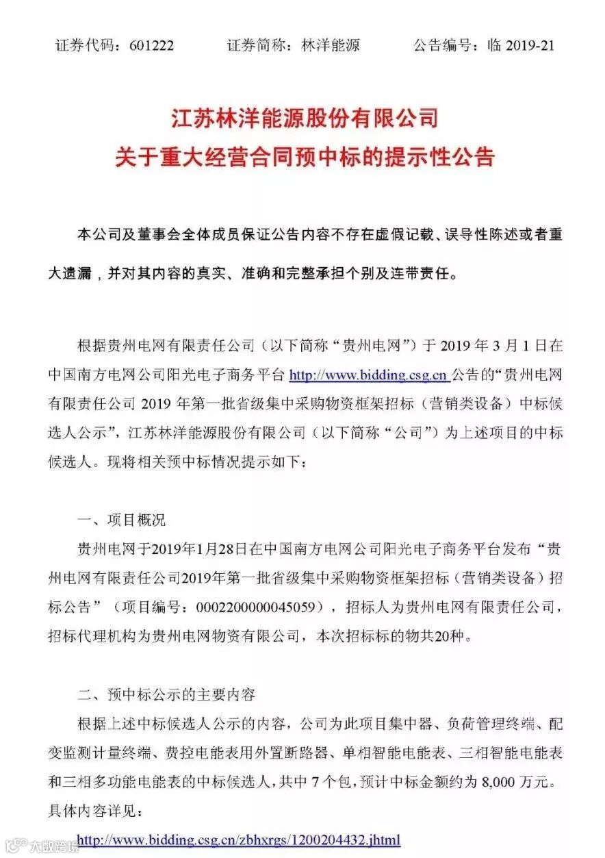 3月1日,贵州电网有限责任公司在中国南方电网公司阳光电子商务平台(www.bidding.csg.cn)公告的“贵州电网有限责任公司2019年第一批省级集中采购物资框架招标(营销类设备)中标候选人公示”,江苏林洋能源股份有限公司(以下简称“公司”)为上述项目的中标候选人,项目包括集中器、负荷管理终端、配变监测计量终端、费控电能表用外置断路器、单相智能电能表、三相智能电能表和三相多功能电能表,共7个包,预计中标金额约为8,000万元。