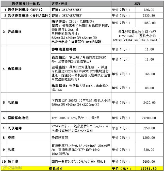 以上报价较贵的主要原因是使用了16节铅酸蓄电池。如果蓄电池数量减至4节,系统成本将降至9元/w,这也是当前光伏离网发电系统合理的价格水平。