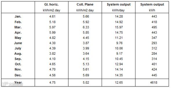 根据Meteonorm气象软件提供的数据,由PVSYS软件进行仿真可得3kW光伏列阵的发电效果如下图所示,可见光伏系统一年可提供4618度电,月均每天提供9.17~15.97度电。