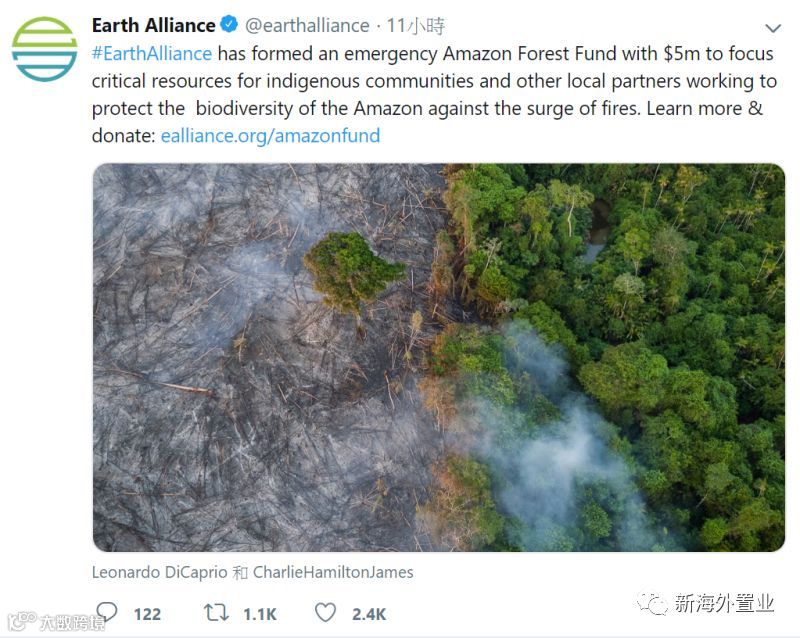 莱昂纳多与经营慈善事业的友人劳伦( Laurene Powell Jobs )、布莱恩( Brian Shet )共同创办新的环保团体「地球同盟」( Earth Alliance ),并且设立 5 百万美元的紧急基金,资助亚马逊雨林原住民及当地 5 个环境保护组织,防止火灾持续延烧、保护原始林貌、资助受灾原住民。